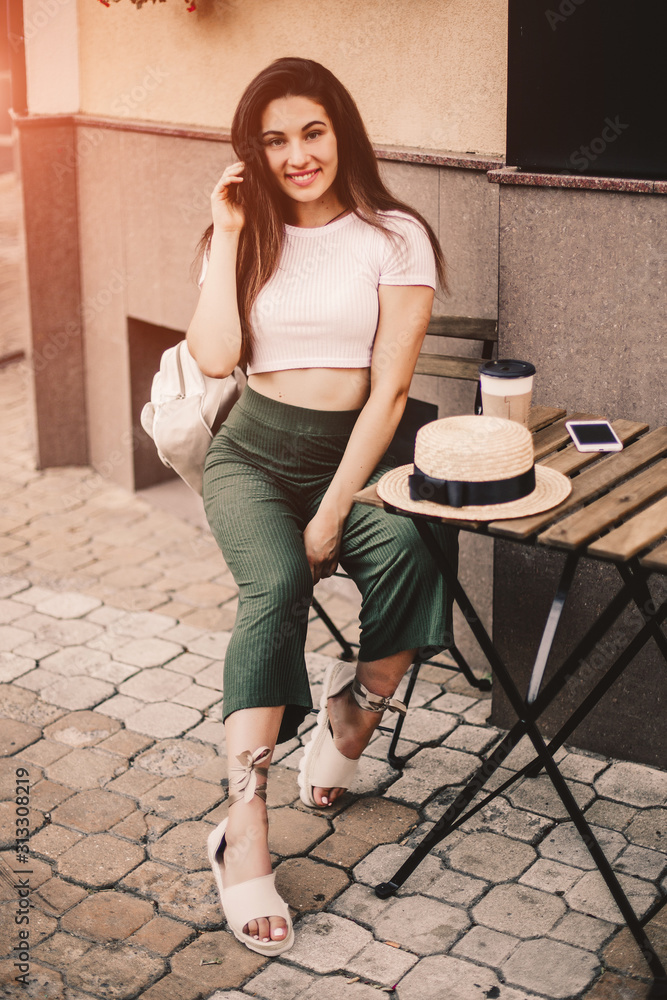 Beautiful woman sitting on street cafe.