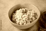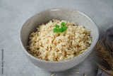Bowl of cooked Whole grain brown rice on wooden background overhead view