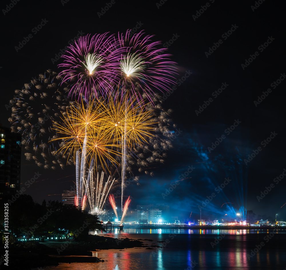 New year 2020 fireworks on the sky at the beach in Thailand.