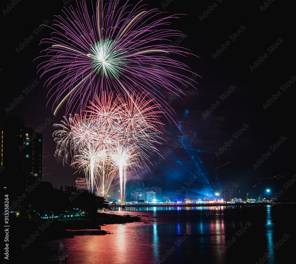 New year 2020 fireworks on the sky at the beach in Thailand.
