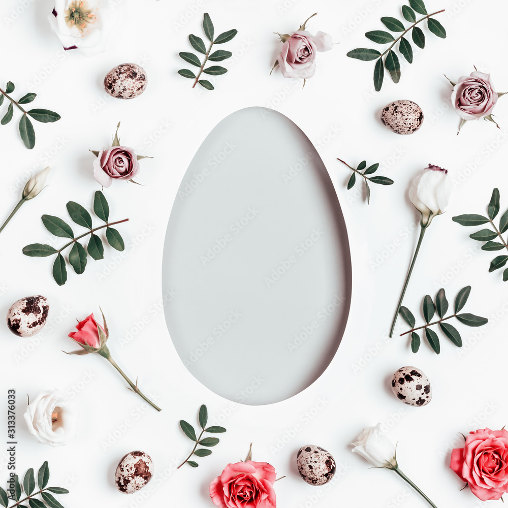 Happy easter concept. Creative layout with floral pattern and quail eggs. Egg shaped hole with copy space