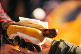 Traditional Delicious German grilled sausages at Christmas market, Germany, December