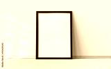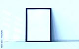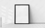 White poster with blank frame on wooden floor. Mockup for you design print.