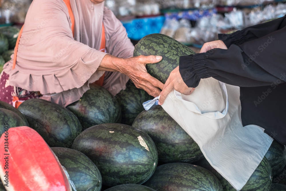 Close up of seller's hand putting watermelon into white reusable cloth or fabric bag at shop.