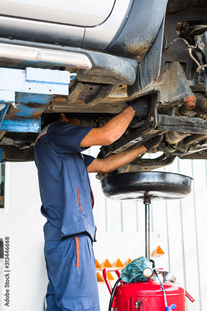 Auto mechanic technician standing under car to replace and change motor engine oil at maintenance repair service station.