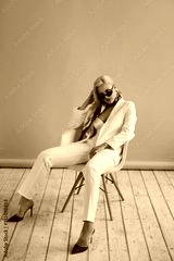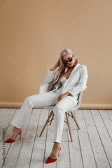 Beautiful young woman with perfect blond hair in elegant white suit and red shoes posing in studio. Fashionable blonde model girl in stylish outfit and sunglasses. Lady boss ready for office meeting