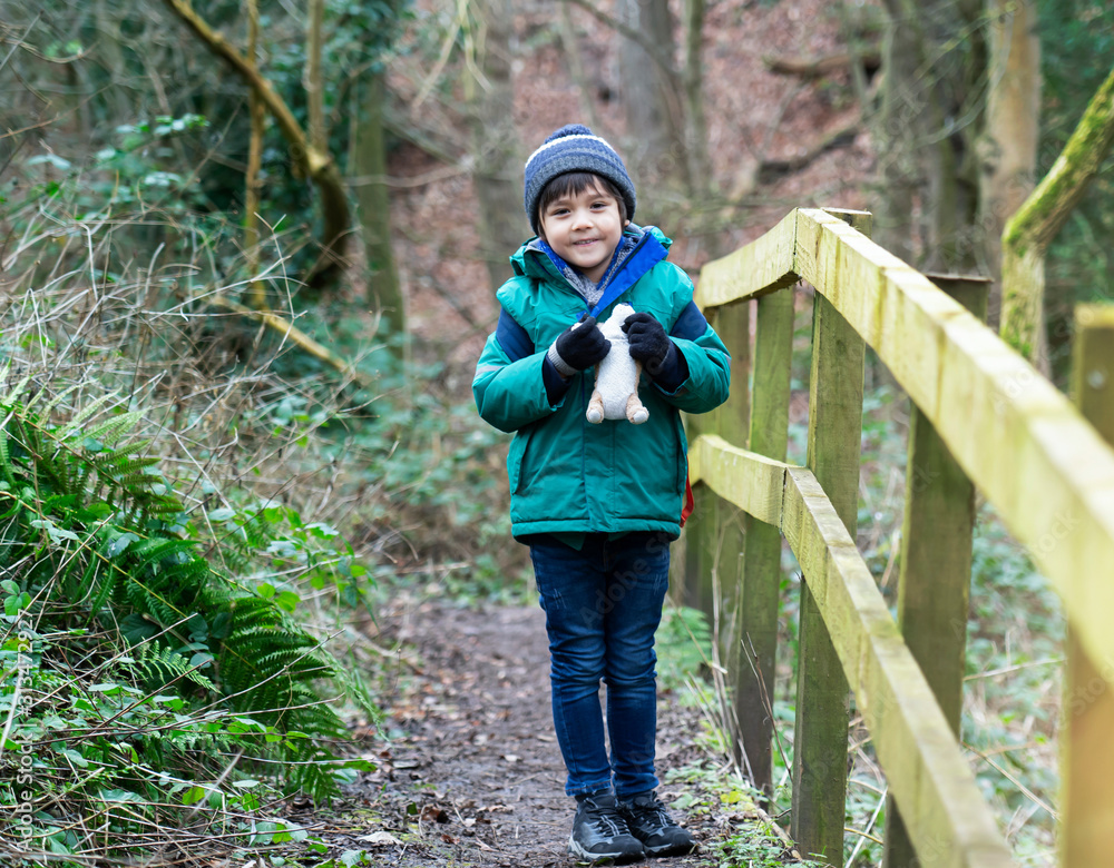 Full length Portrait of healthy boy looking at camera with smiling face, Child explorer and learning about wild nature in countryside, Kid carrying backpack adventure in forest with school trip