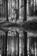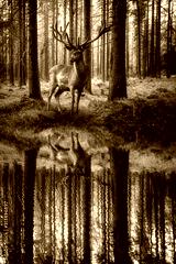 Prächtiger Hirsch mit großem Geweih steht an einem Waldsee