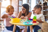 Young beautiful teacher and toddlers playing meals using plastic food and cutlery toy at kindergarten