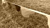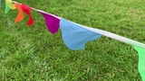 Colorful triangle flags on the string waving in the wind on a soccer field during sport festival