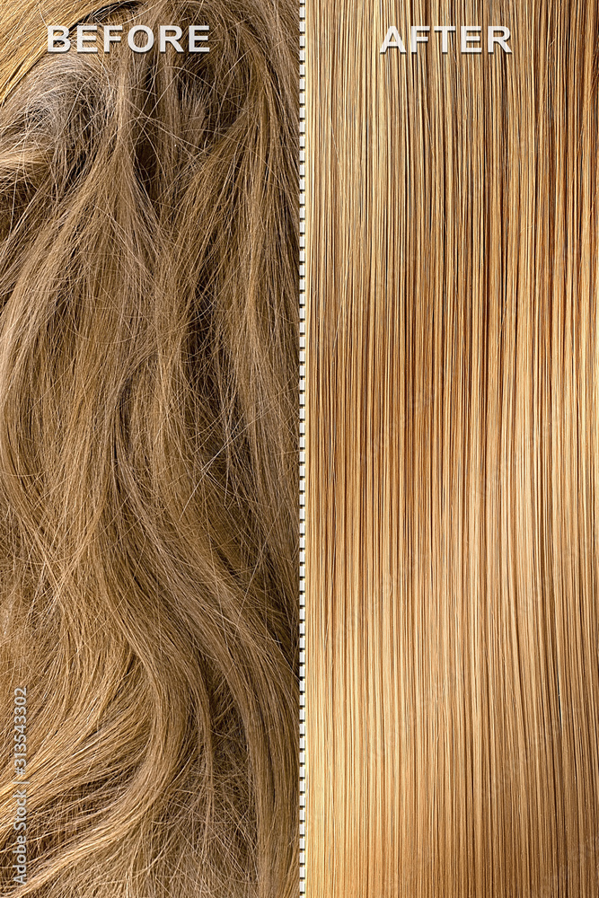Brown hair before and after treatment, straightening