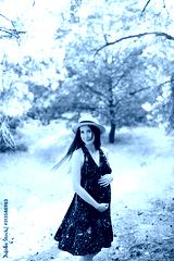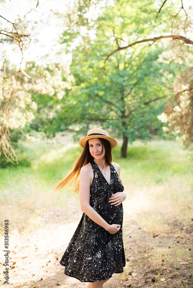 beautiful pregnant young woman in hat and black dress outside, warm sunny picture