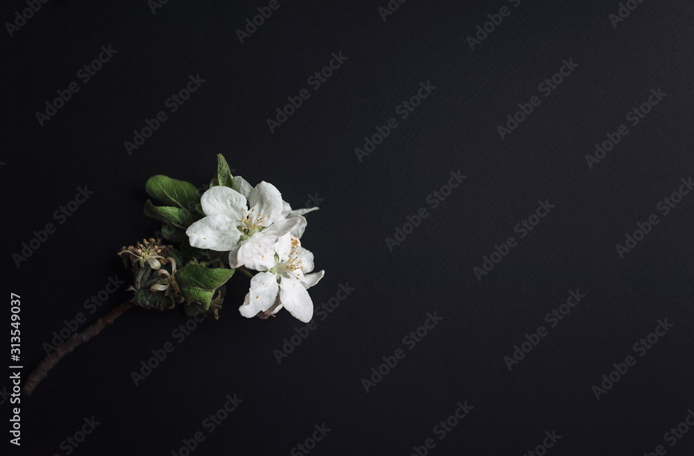 Apple petal and flowers are beautiful lay out on a black background. Minimalist composition. Spring mood, flowering plants. Copy space.