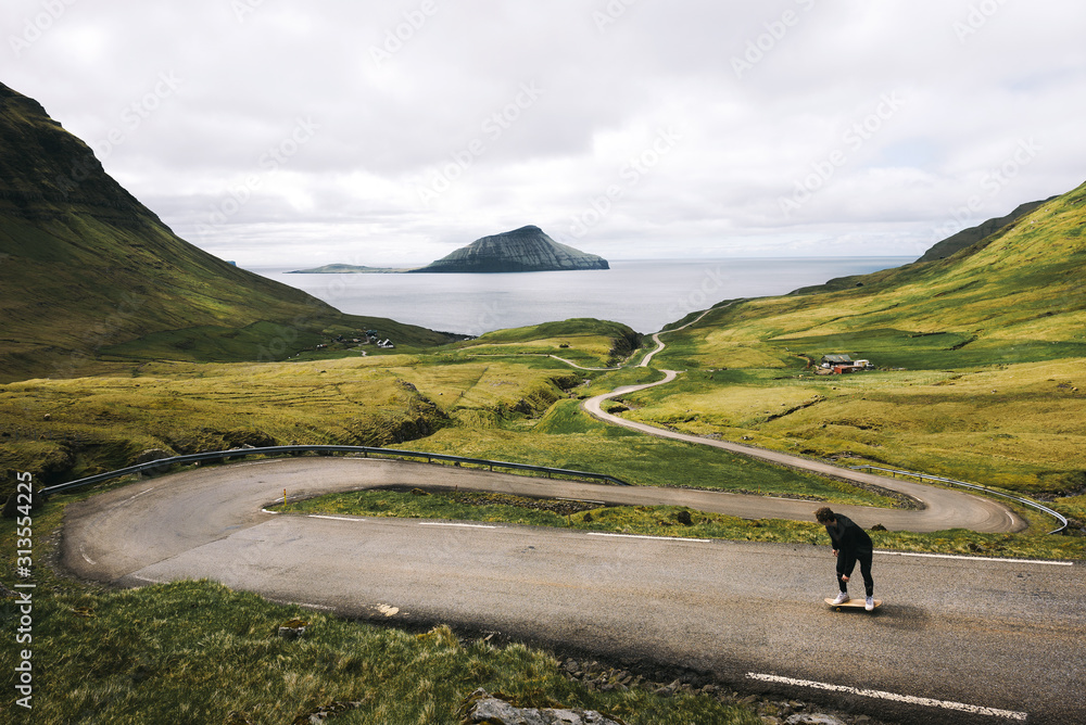Young skater riding a skateboard through the beatiful scenery of Faroe Islands