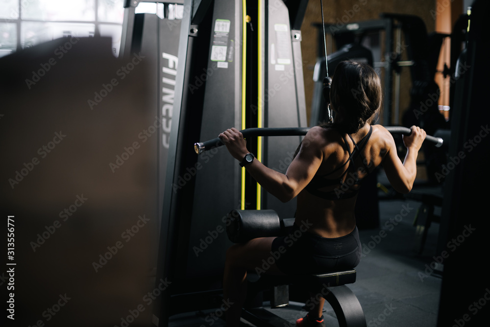 Muscular sporty woman using training simulator for pumping back muscles in gym, back of view. Concept of professional training in a modern dark gym.