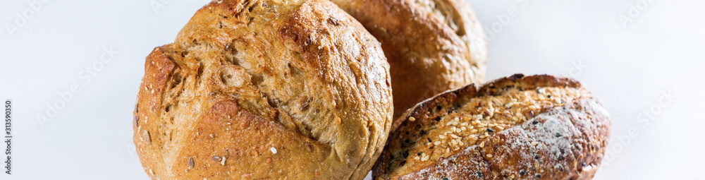 Group of tree whole grain bread with seeds on light