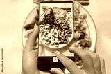 Woman photographing on cell phone homemade food.