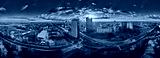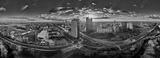Beautiful panoramic aerial drone view to the Сenter of modern Warsaw city with silhouettes of skyscrapers in in the rays of the setting winter January sun - amazing sunset, Poland