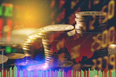 Stack of money coin and Double exposure of graph and rows of coins for finance and business concept