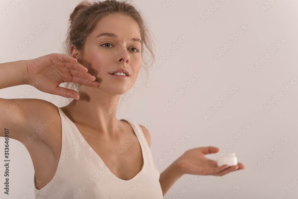 Portrait of a young attractive happy woman with a jar of cream in her hands.