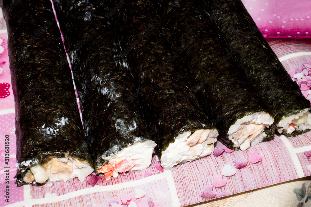 Sushi.Homemade sushi.Making sushi at home.Sushi with rice and fish.
