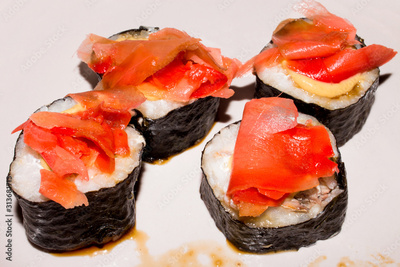 Sushi.Homemade sushi.Making sushi at home.Sushi with sauce and ginger.Sushi background.