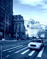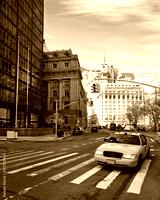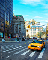 Yellow taxi on road. Street view in Financial District of Lower Manhattan, New York of USA. Skyline and cityscape with skyscrapers at United States of America, NYC, US. American architecture.