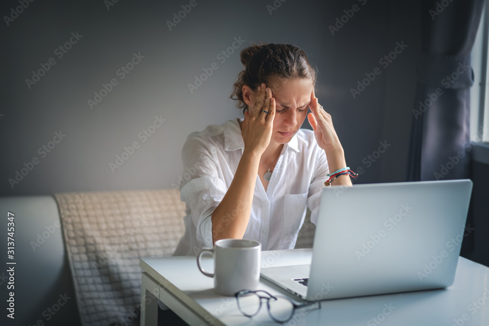 Young pretty woman in a white shirt sits at a table in front of a laptop, her eyes and head ache, workaholism, stress burnout