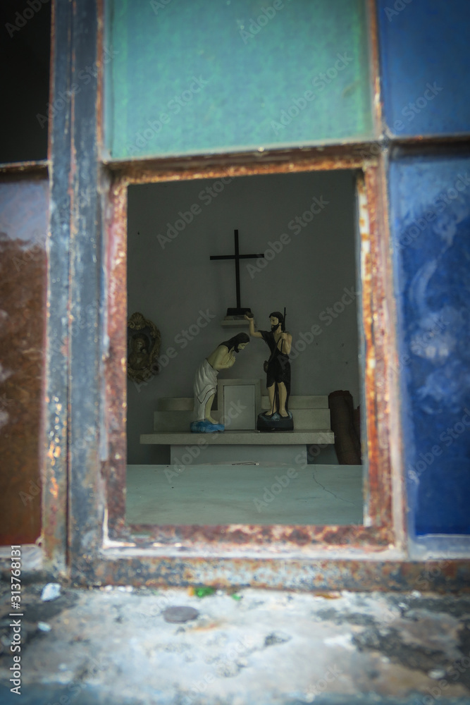 Broken Stained Glass Window With Rustic Catholic Figurines