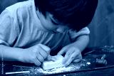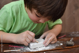 Children having fun with archaeology excavation kit. Boy plays an archaeologist excavated, training for dig fossil