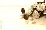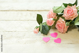 bouquet of small pink roses lying on white textured table with hearts