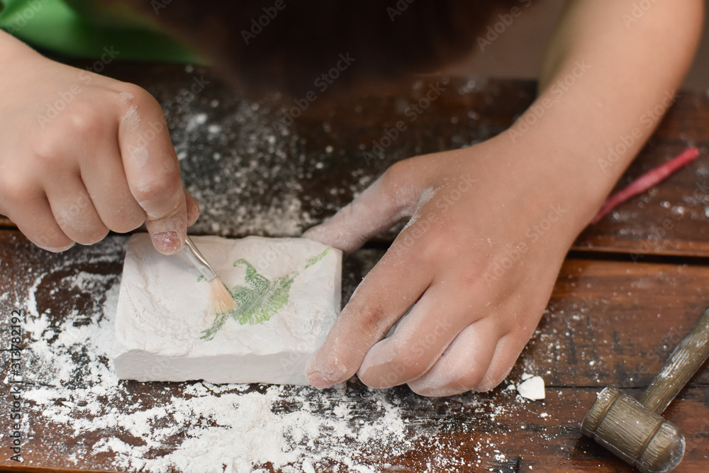 Child's hand is playing with the archaeological set. Child digging a dinosaur. Boy have fun with archaeology excavation kit