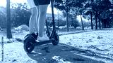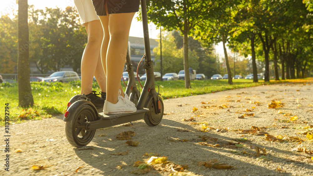 CLOSE UP: Two unrecognizable female friends ride e-scooters down gravel walkway.