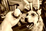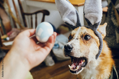 Cute golden dog in grey bunny ears playing with owner, trying to eat stylish easter egg in room. Lifestyle photo. Adorable dog sniffing easter egg, showing tongue. Happy Easter