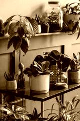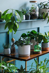 Stylish living room interior filled a lot of beautiful plants in different design pots on the brown retro shelf. Composition of home garden jungle. Modern home decor. Floral concept. Template.