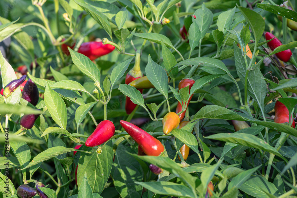Colorful Chili paper and ripe on tree.Capsicum Frutescens tree.(Tabasco pepper)