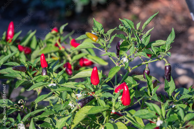 Colorful Chili paper and ripe on tree.Capsicum Frutescens tree.(Bird Chili)