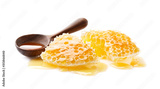 Honeycomb with honey drop on white background