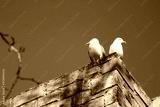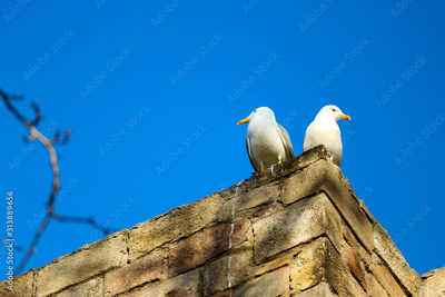 Two seagulls on the top of medieval tower of Barcelona city wall against a bright blue sky