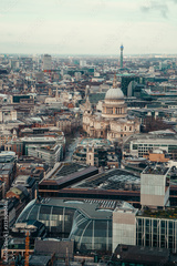 Panoramic view of the City of London, a financial district in the center of London, United Kingdom, with St Paul's Cathedral from the viewing platform at Sky Garden, a skyscraper on Fenchurch street