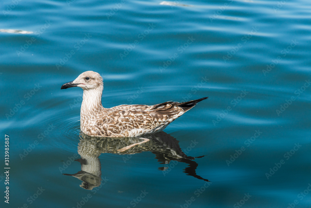 A duck swimming in the blue sea water