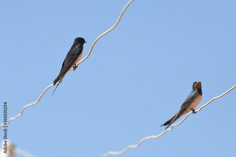 Swallow (bird) on wire over blue sky. Barn swallow in Europe in spring, migratory bird
