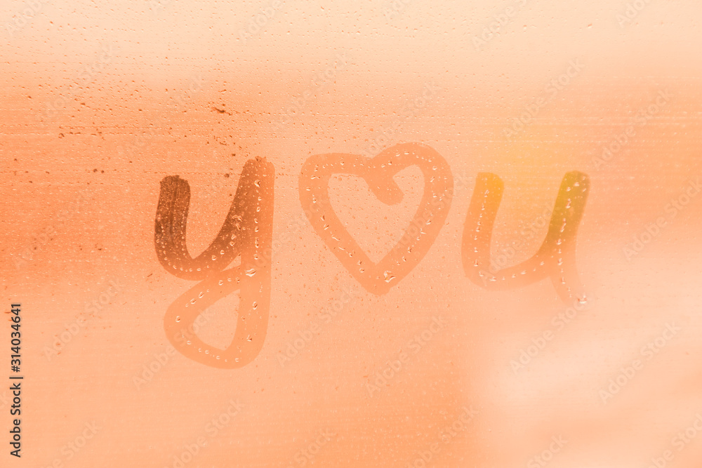The romantic inscription I love you on the orange or pink evening or morning window glass with drops