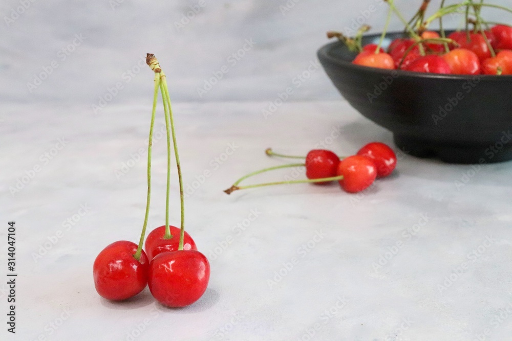 Cherries in black bowl. Red cherry. Fresh cherries. Cherry on grey background. Healthy cherry fruits.