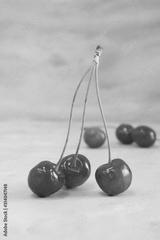 Cherries in black bowl. Red cherry. Fresh cherries. Cherry on grey background. Healthy cherry fruits.