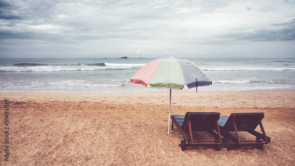 Two sunbeds and umbrella on an empty beach, color toning applied, Sri Lanka.
