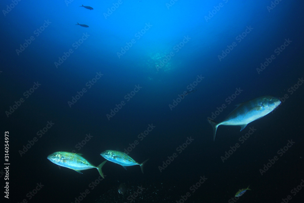 Underwater scene of Trevally fish in ocean