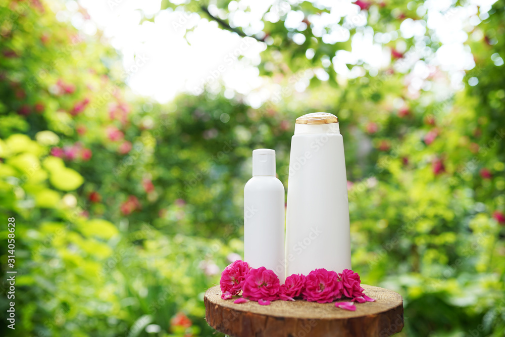 Organic essential aroma oil with shower gel on wooden background. Selective focus.