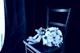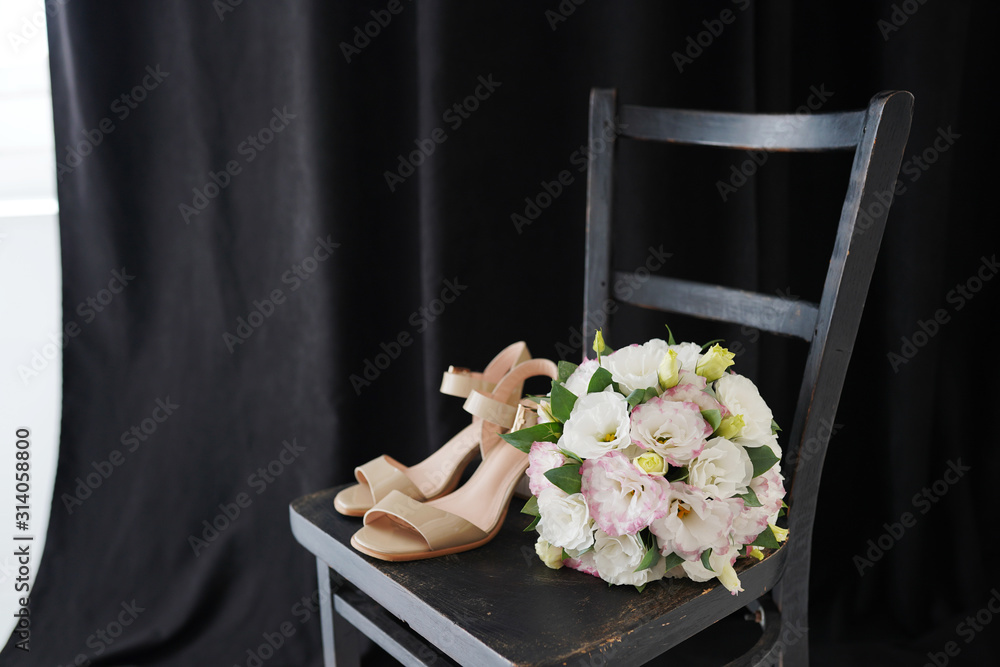 Beautiful wedding bouquet with shoes on a black chair on black background
