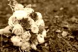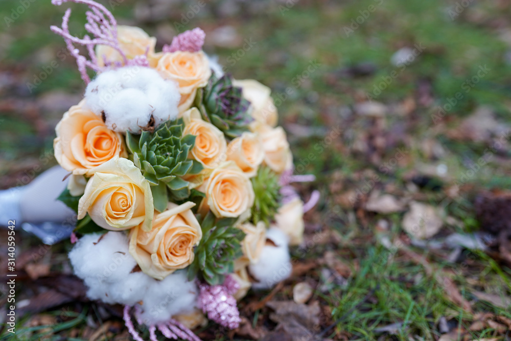 The bride's bouquet with pink and white flowers and greenery on the ground